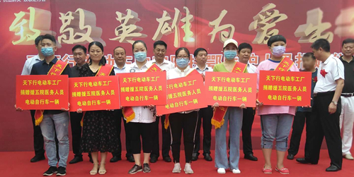 2020年6月16日上午,由天下行电动车工厂主办,安阳内黄商会协办的,向援鄂医护人员捐赠电动车仪式,在安阳天下行电动车工厂店隆重举行。安阳市政协副主席、市工商联主席侯合柱、安阳市委统战部副部长、市工商联党组书记郭洪侠、安阳市工商联副主席杨波、安阳市中医院院长尉建华、安阳市政协委员、安阳市工商联(总商会)副会长、安阳内黄商会会长宰春成及安阳市新能源商会、紫薇大道办事处、紫薇工商所领导参加了捐赠仪。