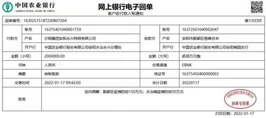 沙钢集团永兴特钢有限公司捐款200万元。