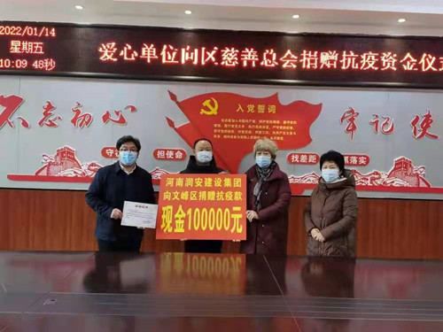 1月14日上午,市房地产业商会副会长单位——河南润安建设集团向文峰区慈善总会捐款10万元,以实际行动支持我市抗疫斗争,展示出了民营企业大爱无疆、贡献力量、勇于承担社会责任的博大胸怀!文峰区政府、区民政局、区慈善总会有关领导和负责人出席捐赠仪式。