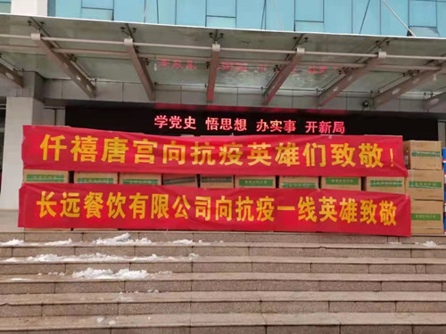 本次仟禧唐宫和长远餐饮共捐赠医用防护服400套,N95防护口罩6000个,医用外科口罩40000个,和一批盼盼面包、方便面、八宝粥等。